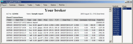 Features ![]() Works with MetaTrader 3 and 4, with live, demo, or StrategyTester reports! Summary with lots of info, both in pips and in dollar amounts! Select pairs with a single mouse-click, view only the pairs you want to see! Graph display of balance, with a clear view of drawdown! Extensive list with trades, deleting trades is easy! Graph distribution of times of days, unique feature! Try several money management strategies on your trades! Use the Monte Carlo simulator Risksim to find statistics on your strategy! Combine several reports into one, and create multi-pair StrategyTester reports! Save your report with or without balance graph, or export your trades to Excel! |